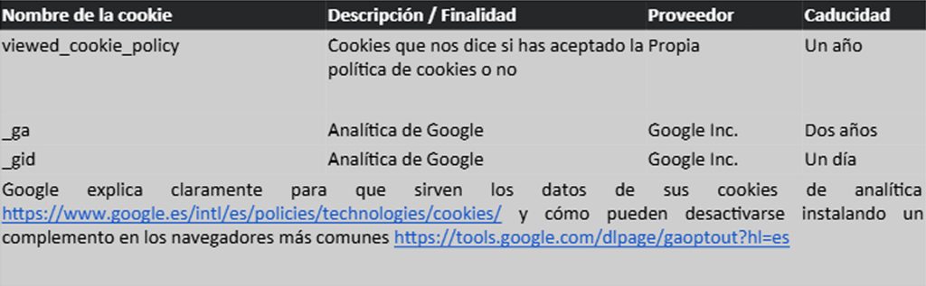 Según la Ley 34/2002, de 11 de julio, de Servicios de la Sociedad de la Información y Comercio Electrónico, le informamos de que este sitio web usa Cookies para mejorar y optimizar la experiencia del usuario. A continuación, encontrará información detallada sobre qué son las “Cookies”, qué tipología utiliza este sitio web, cómo cambiar la configuración de sus cookies, y qué ocurre si las deshabilita.